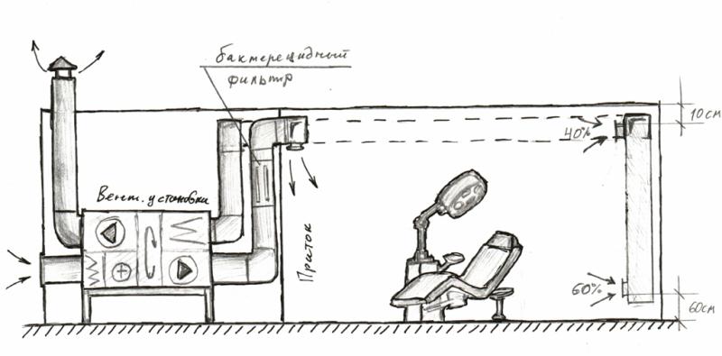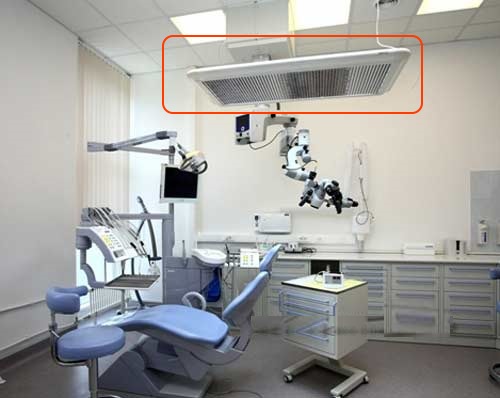 Le plus souvent, dans les cabinets dentaires, il est nécessaire d'utiliser un système de ventilation par aspiration (assure l'évacuation de l'air extrait), qui fonctionne en conjonction avec un système d'alimentation en air (responsable de l'apport d'air pur). Dans un certain nombre de pièces, la ventilation est autorisée en raison de la ventilation. Le système de ventilation d'alimentation est une combinaison de filtres de nettoyage, d'un ventilateur, d'un radiateur (chauffage), de communications de raccordement (conduits d'air), de silencieux, etc.