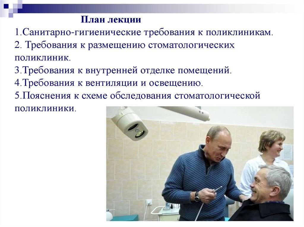 SanPiN pour une institution telle que la dentisterie prévoit le respect d'un certain nombre d'exigences particulières. Par exemple, si l'emplacement d'une organisation de soins dentaires coïncide avec un immeuble résidentiel, leurs systèmes de ventilation doivent être séparés. La prise d'air de la rue doit être effectuée à partir d'une zone propre, qui ne doit pas être inférieure à deux mètres du sol.