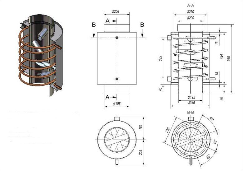 Vous devez commencer par un projet - réfléchir aux petites choses et choisir les options. Cela vaut la peine de partir de la taille - si le four est faible, un échangeur de chaleur disproportionné ne fera que nuire. Si vous utilisez du cuivre comme tuyau pour la bobine, la longueur ne doit pas dépasser trois mètres.