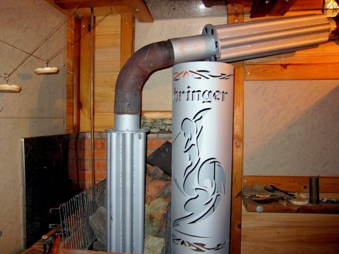 Certains artisans recouvrent également ces échangeurs de chaleur d'un treillis de pierres pour l'accumulation de chaleur et décorent le support de l'échangeur de chaleur. Le grenier dans ce cas s'avère encore plus confortable et peut être utilisé comme espace de vie. Après tout, selon la pratique, la température du tuyau d'un poêle de bain ne dépasse pas 160-170 ° C, s'il y a un échangeur de chaleur dessus. Et la température la plus élevée ne sera déjà que dans la zone de la porte. Chaleureux et sécuritaire!