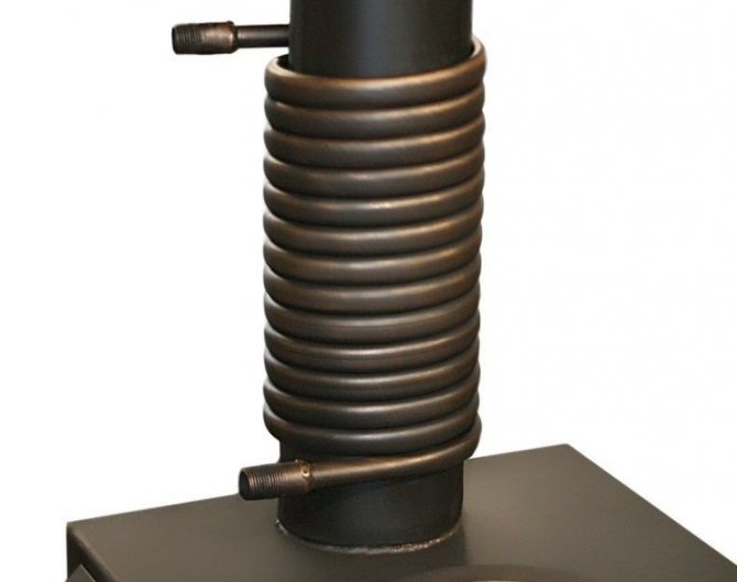Cette option est simple, pratique et pratique. En fait, ici, la cheminée est simplement enroulée autour d'un tuyau en métal ou en cuivre, elle est constamment chauffée et l'air distillé à travers elle devient rapidement chaud.