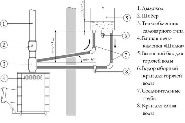 Pour les poêles des petits hammams, les échangeurs de chaleur peuvent être installés directement sur la cheminée. La conception du serpentin à eau chaude n'est pratiquement pas différente des échangeurs de chaleur intégrés, le seul inconvénient est la nécessité d'installer un réservoir de stockage supplémentaire pour l'eau chaude.