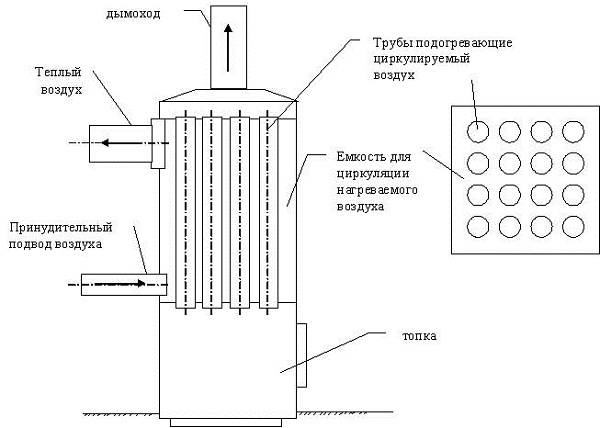 L'échangeur de chaleur à air à faire soi-même pour la cheminée a une conception simple. Il a un boîtier en métal, à l'intérieur duquel se trouvent des tuyaux d'entrée et de sortie. Le principe de fonctionnement du produit est simple et se voit sur cette photo.