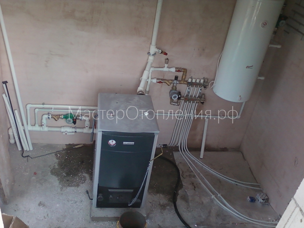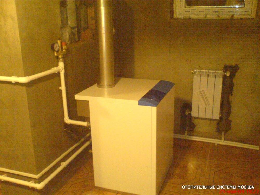 • La chaudière est installée sur une base incombustible. Si les sols de la chaufferie sont en bois, une feuille de carton d'amiante ou de laine minérale est posée, sur le dessus - une feuille de métal. La deuxième option est un podium en brique, plâtré ou carrelé.