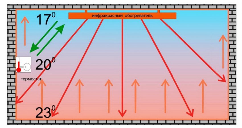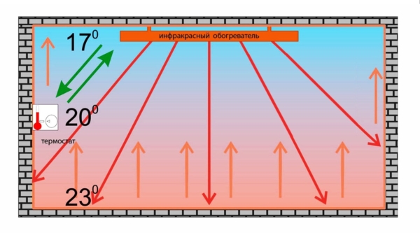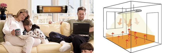 - propagation rapide de la chaleur dans toute la pièce chauffée - le rayonnement infrarouge se propage à la vitesse de la lumière et sur une distance assez importante (l'air chaud des convecteurs diverge à travers la pièce dix fois plus lentement) ;