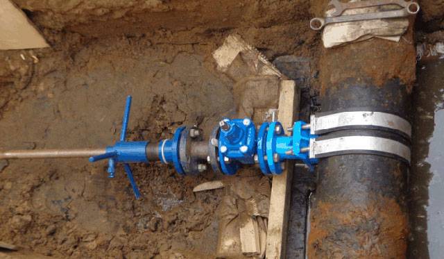 - Une pince avec une bride et un tuyau est installée sur la surface nettoyée. De l'autre côté, un robinet-vanne avec un manchon est monté. L'appareil dans lequel se trouve le couteau est fixé ici. Avec sa participation, une insertion dans le régime général est réalisée.