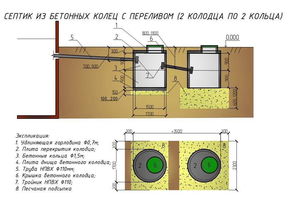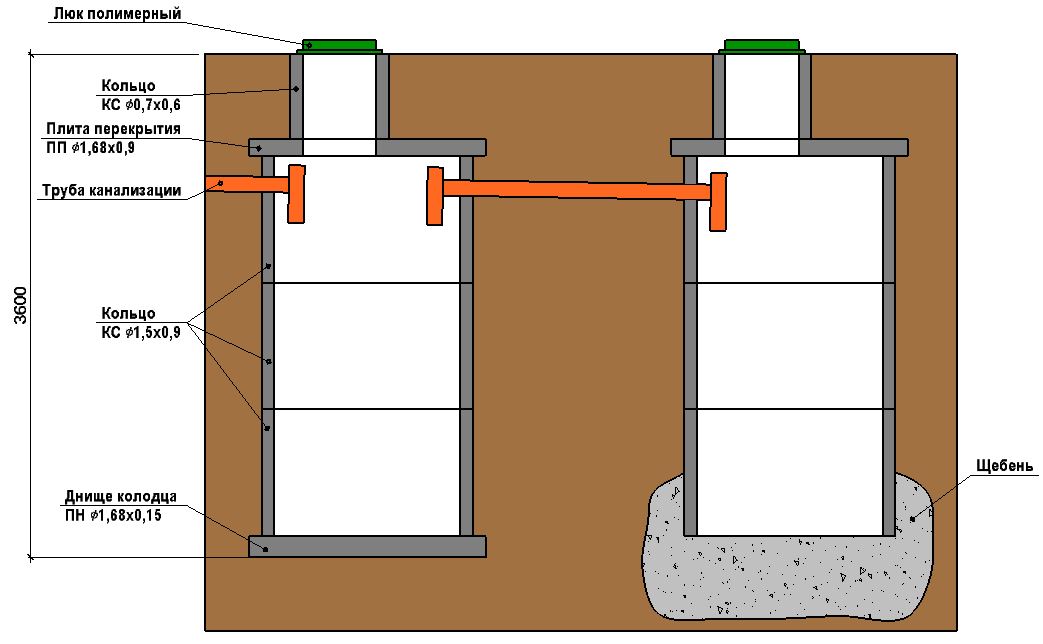 Les dimensions de la fosse dépendent des anneaux et des exigences de sécurité. Ainsi en contact étroit avec la nappe phréatique, une bonne étanchéité est assurée. Lorsqu'ils utilisent un équipement spécial, ils creusent immédiatement une fosse volumétrique en deux chambres. Si des travaux de bricolage sont effectués, une fosse séparée est prévue pour chaque conteneur.