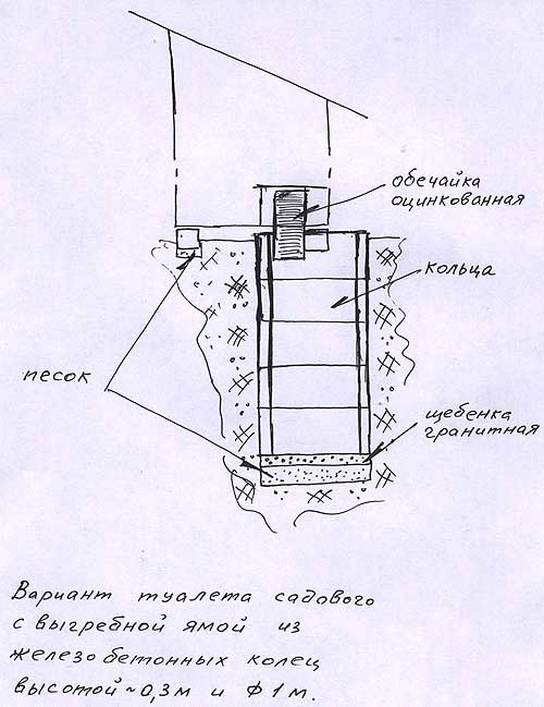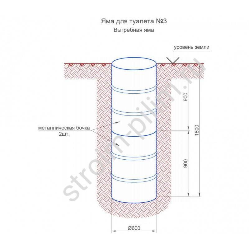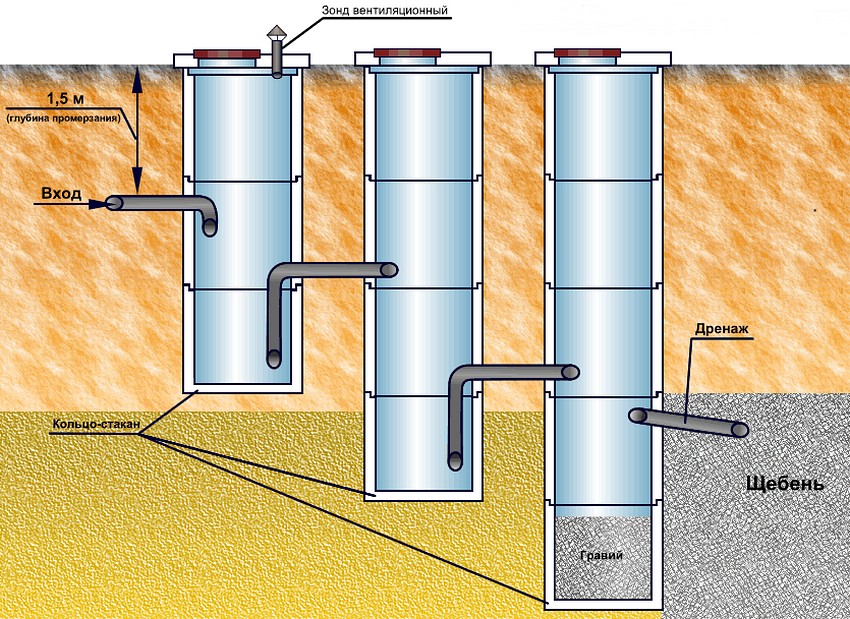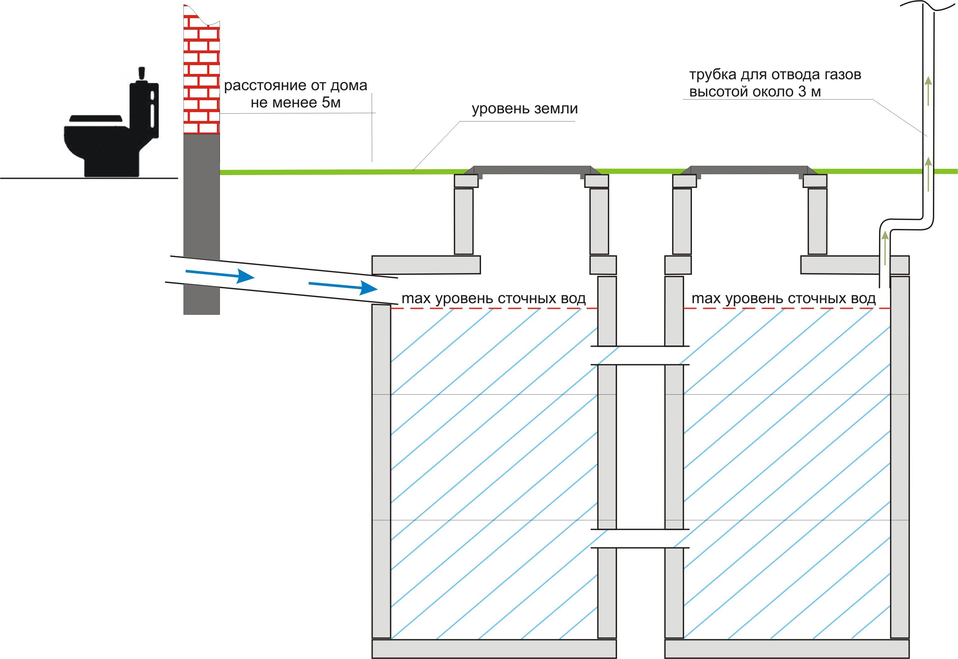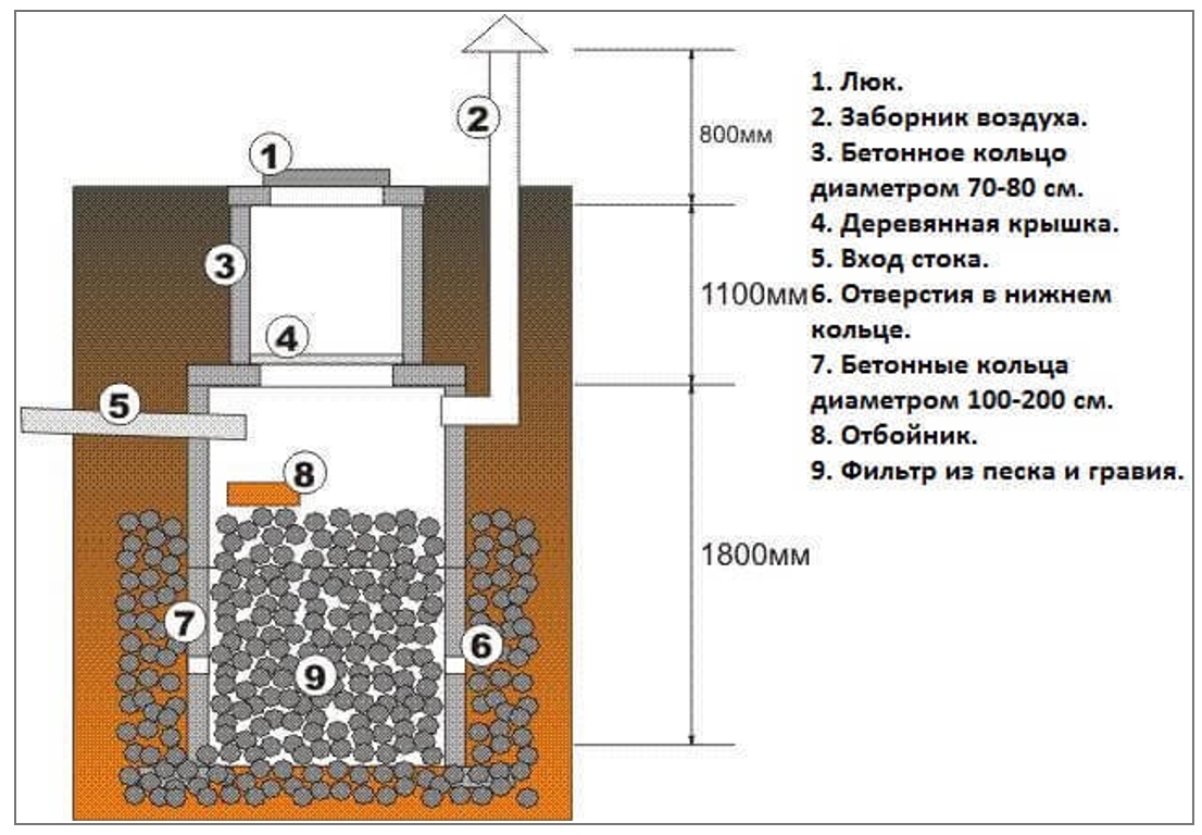 Les bactéries du sol se nourrissent de matière organique, la transformant. La profondeur de la fosse dépend du nombre de membres de la famille et de l'intensité des déchets. En moyenne, 120 à 200 litres par jour sont consommés par personne. Liquide avec de l'eau s'infiltre à travers le gravier après 3 jours.