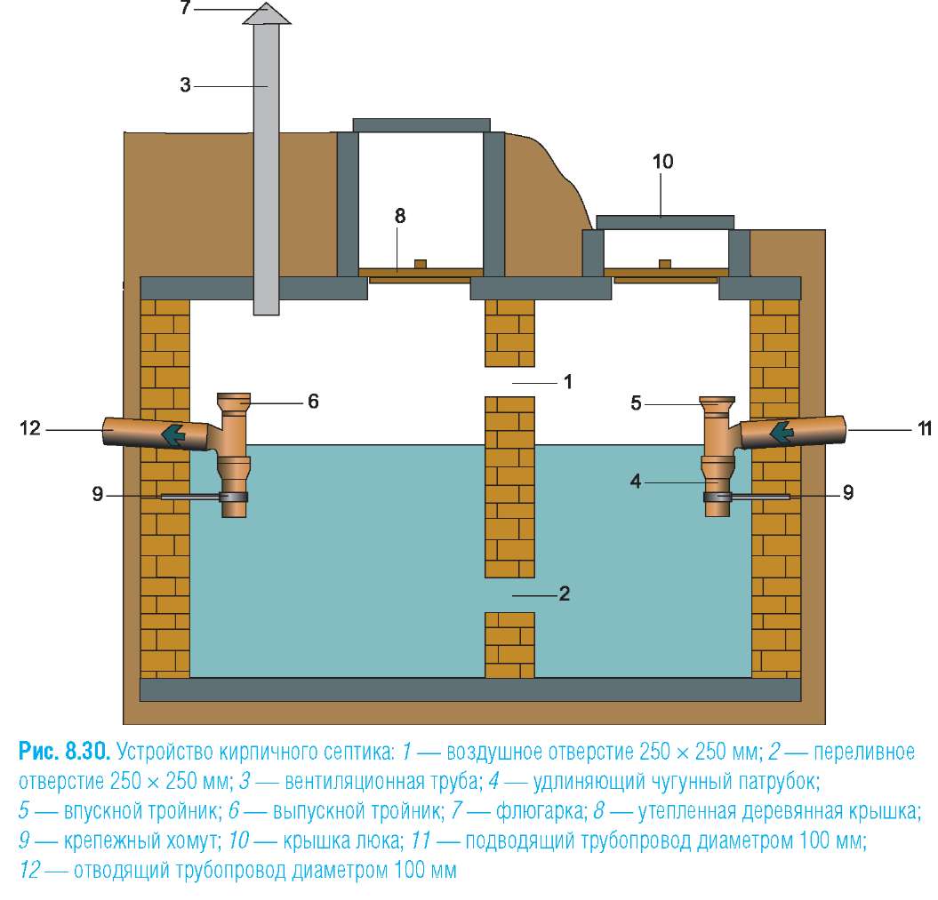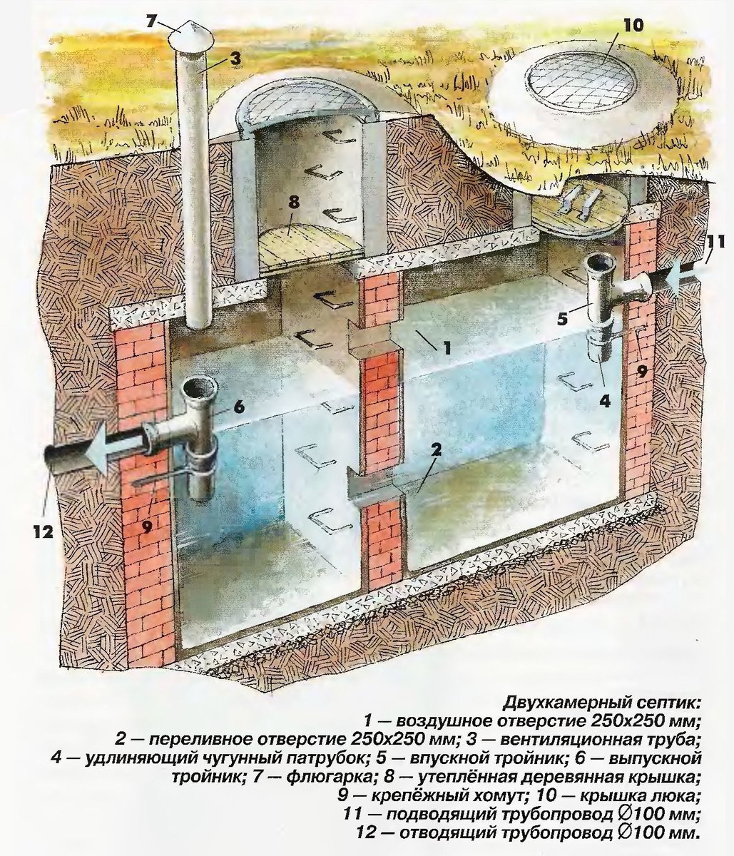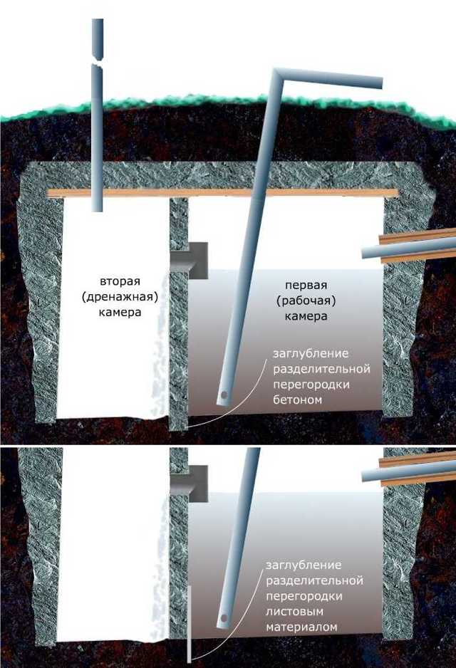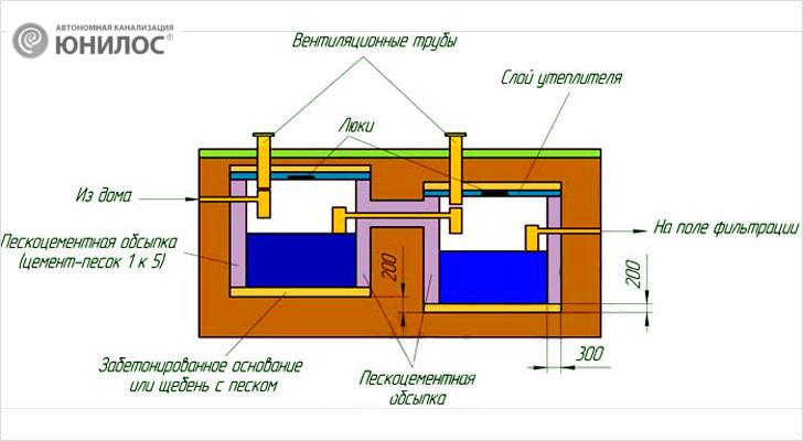 Dans une fosse de vidange à deux chambres, les suspensions d'égout se déposent et la clarification des eaux usées se produit bien mieux que dans un bunker à une chambre (+)