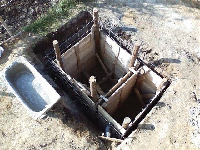 - Une fosse est creusée pour s'adapter à la taille et à la forme du récipient. Les dimensions de la fosse sont 50 cm plus grandes de chaque côté. Le creusement est effectué manuellement avec des pelles ou une excavatrice.