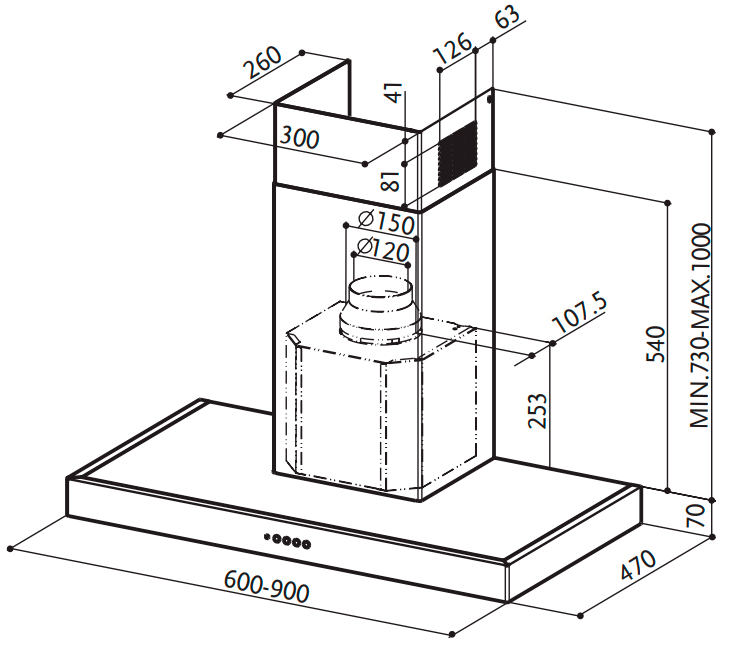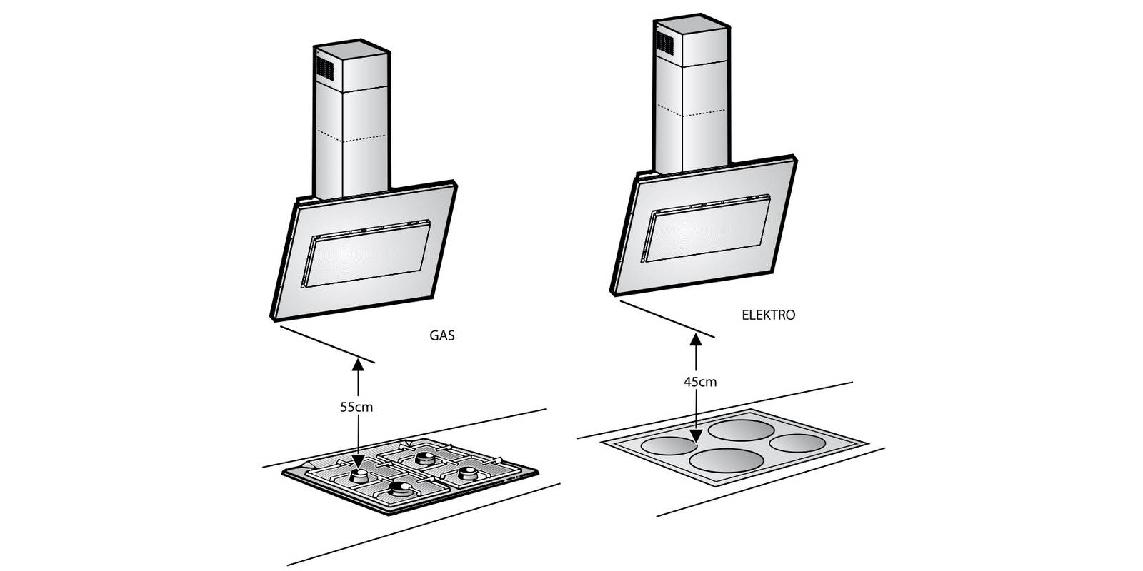 Une autre exigence est que la hotte soit installée le plus près possible de la table de cuisson. C'est au moins 65 cm pour cuisinière électrique et 75 cm pour le gaz.