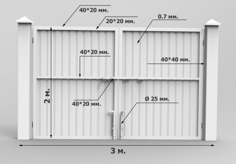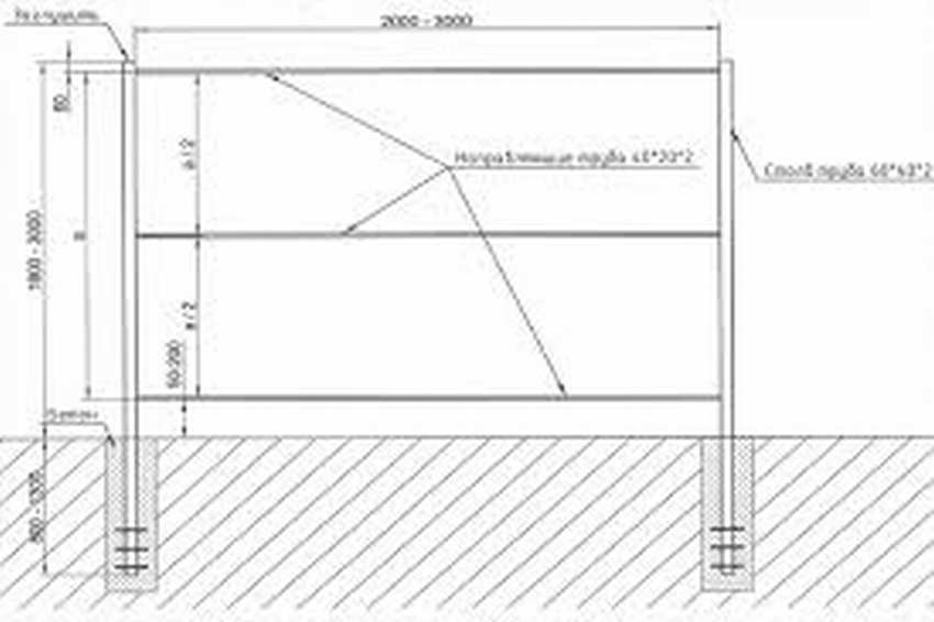 Pour les piliers, ils prennent généralement un tuyau profilé d'une section de 60 * 60 mm avec une épaisseur de paroi de 3 mm. La distance entre les poteaux est de 2 à 3 mètres. Plus l'épaisseur de la tôle profilée est grande, moins vous pouvez mettre de poteaux. Si le sol est difficile à creuser, il est logique d'agrandir les distances, sinon vous pouvez économiser sur l'achat de métal - plus il est fin, moins cher et la différence de prix est importante.