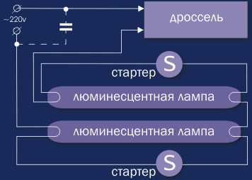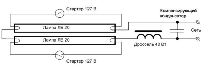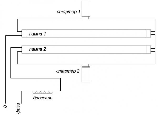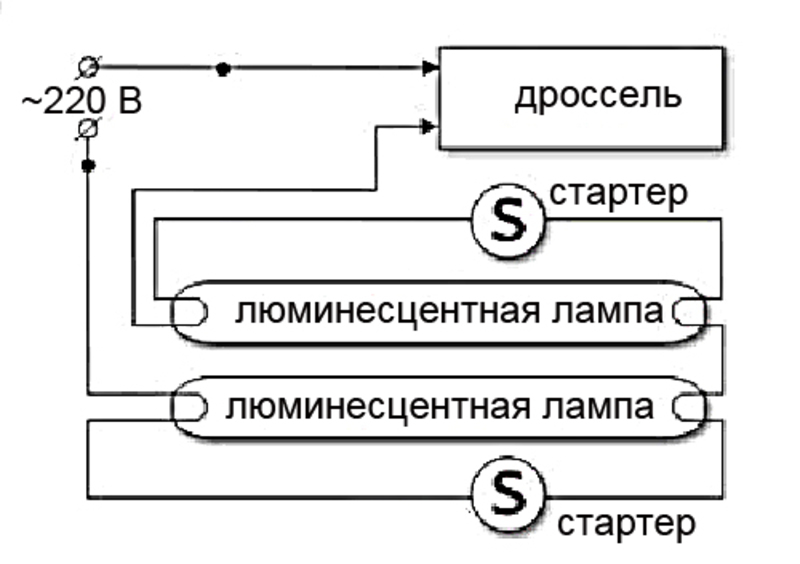 Dans un tel cas, il est nécessaire d'utiliser une paire de starters, un par lampe. Lors du raccordement d'une paire de lampes à un seul starter, il est impératif de tenir compte de sa puissance nominale indiquée sur le boîtier. Par exemple, si sa puissance est de 40 W, il est alors possible d'y connecter une paire de lampes identiques dont la charge maximale est de 20 W.