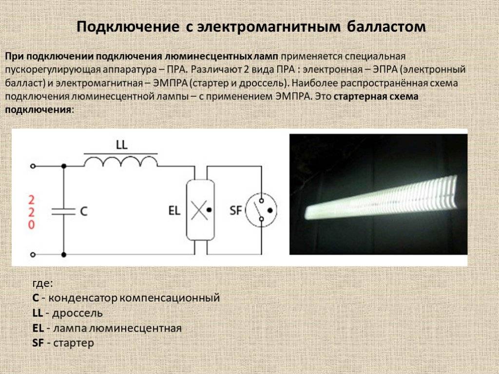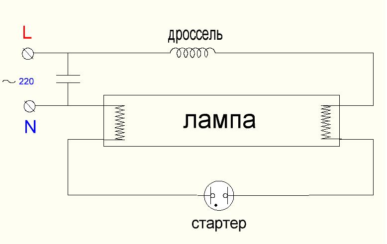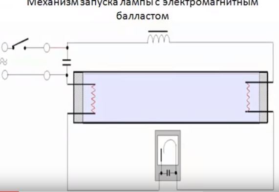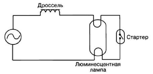 Un starter pour lampes fluorescentes (une bobine d'induction spéciale constituée d'un conducteur enroulé) est impliqué dans la suppression du bruit, le stockage d'énergie et le contrôle de la luminosité en douceur.