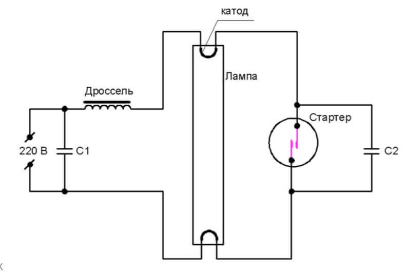 Afin d'augmenter l'efficacité et de réduire les interférences qui se produisent lorsque la lampe est allumée, le circuit est équipé de deux condensateurs. L'un d'eux (plus petit) est situé à l'intérieur du démarreur. Sa fonction principale est d'éteindre les étincelles et d'améliorer l'impulsion du néon.