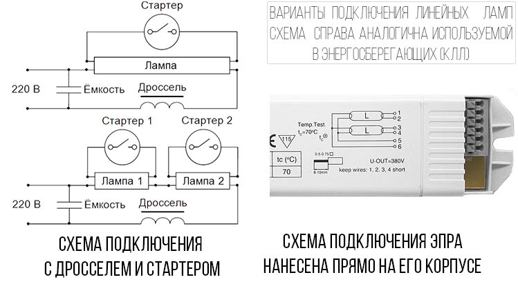De plus, il existe une connexion de lampe fluorescente qui n'utilise pas de démarreurs.Grâce à l'utilisation de ballasts électroniques spécialisés, la lampe s'allume instantanément, sans "clignoter" les circuits de commande du démarreur.
