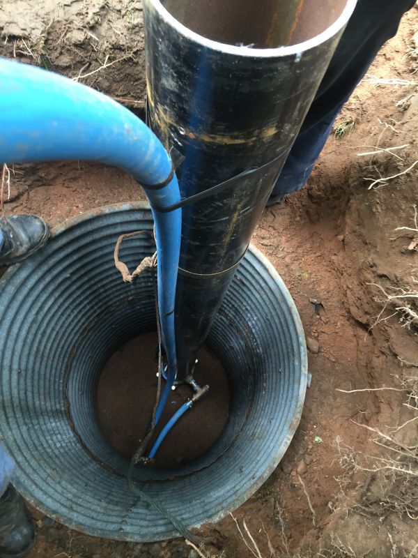 La pompe est descendue dans le puits La pompe est descendue avec câble d'alimentation, tuyau et corde La pompe est presque descendue