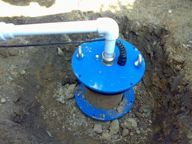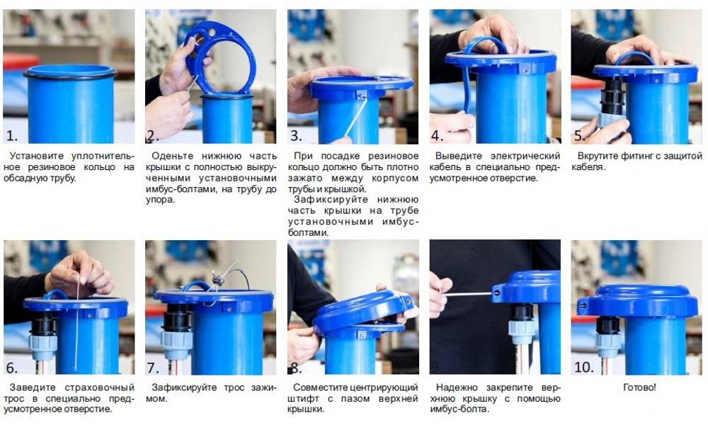 - Couvercle. La partie supérieure de la structure, lors de l'installation, est plaquée contre la bride par l'intermédiaire d'un joint élastique. Les ouvertures du couvercle sont conçues pour permettre le passage du câble d'alimentation et du tuyau/tuyau d'alimentation en eau. Dans la partie inférieure se trouve un mousqueton boulonné - une pompe y est suspendue à un câble.