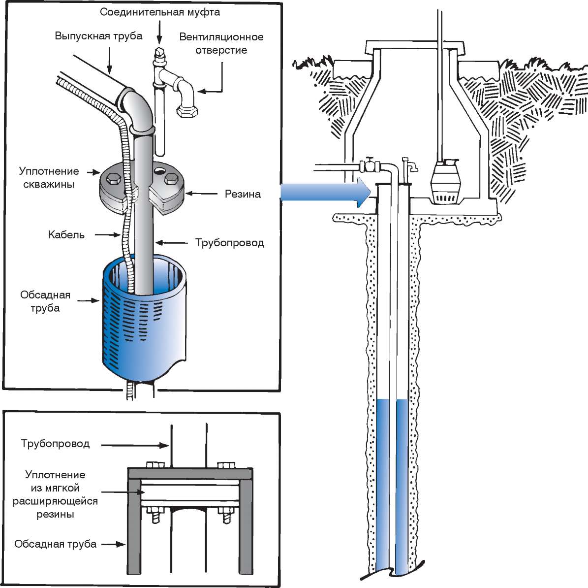 Lors de l'installation, nous passons la pompe sur un câble avec un tuyau à travers une bride avec un joint torique