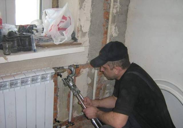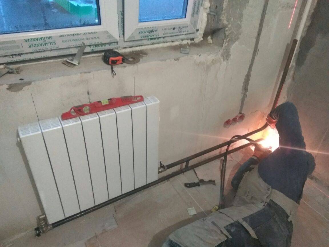 L'eau est complètement évacuée du système de chauffage, après quoi les anciennes batteries sont découpées avec un broyeur.Les extrémités des tuyaux sont soigneusement nettoyées de la saleté et de la rouille, après quoi une nouvelle batterie est installée dans l'espace libéré et soudée aux tuyaux du système de chauffage à l'aide d'une machine à souder.