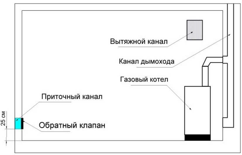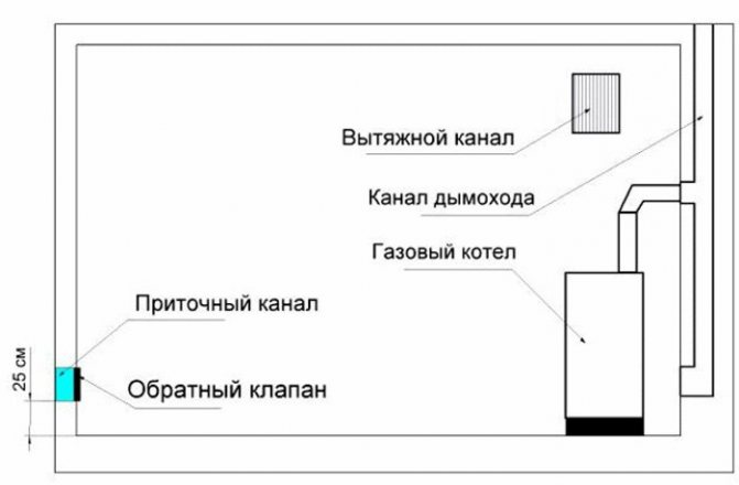 - la présence d'une ventilation dans la chaufferie basée sur le calcul - évacuation à raison de 3 échanges d'air par heure, entrée d'air - volume d'évacuation + air nécessaire à la combustion du gaz (si la chaudière a une chambre de combustion ouverte. S'il y a une chambre fermée chambre de combustion, l'air comburant n'est pas prélevé dans la pièce, et par une cheminée coaxiale) ;