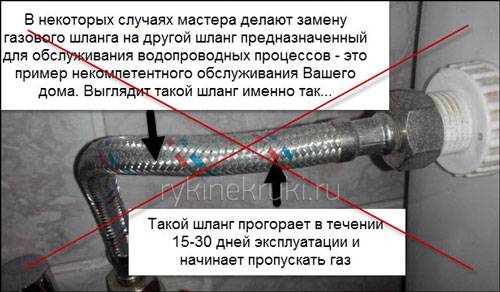 Il arrive parfois qu'un employé négligeant dans ses devoirs laisse un entraînement supplémentaire du robinet dans la descente ou mette le tuyau dans la descente. Il est interdit de faire cela. Le boyau doit être raccordé au robinet et à la cuisinière à gaz. Le maximum autorisé est un adaptateur. Tous les tuyaux supplémentaires sont exclus.