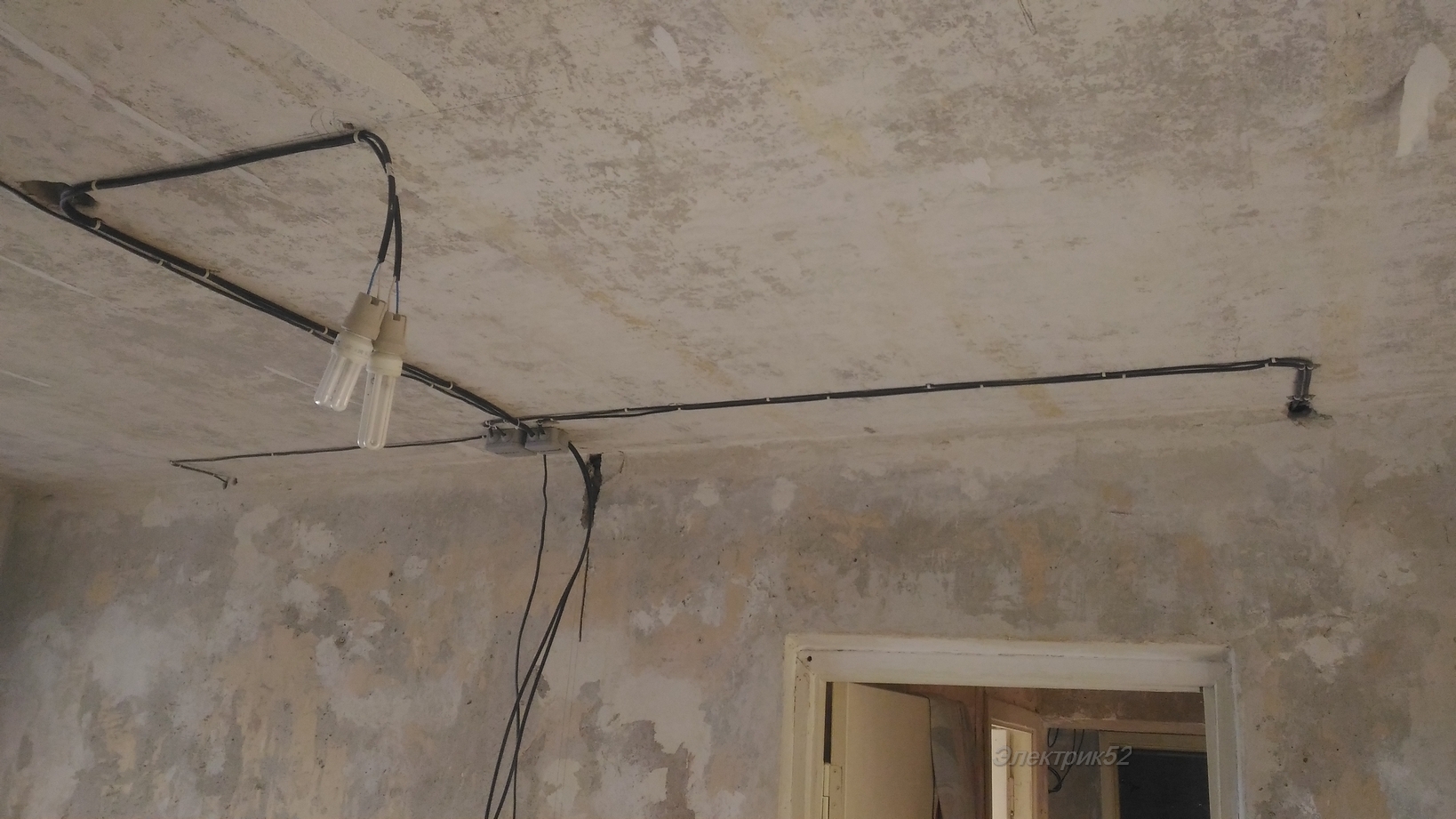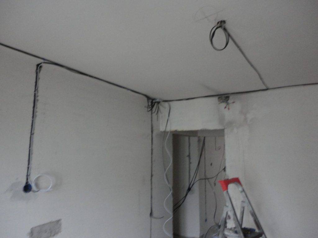 Une autre option consiste à conduire le câblage électrique le long du plafond et à ne faire des stroboscopes que dans les lieux de descente vers les prises et les interrupteurs. Vous pouvez masquer le câble attaché par le haut en réalisant un plafond tendu ou suspendu.