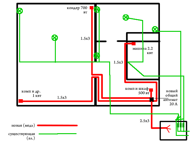 7. Pour connecter des consommateurs puissants au réseau électrique (cuisinière électrique ou machine à laver, par exemple), un fil d'une section de 6,0 mm2 est posé dans le projet.