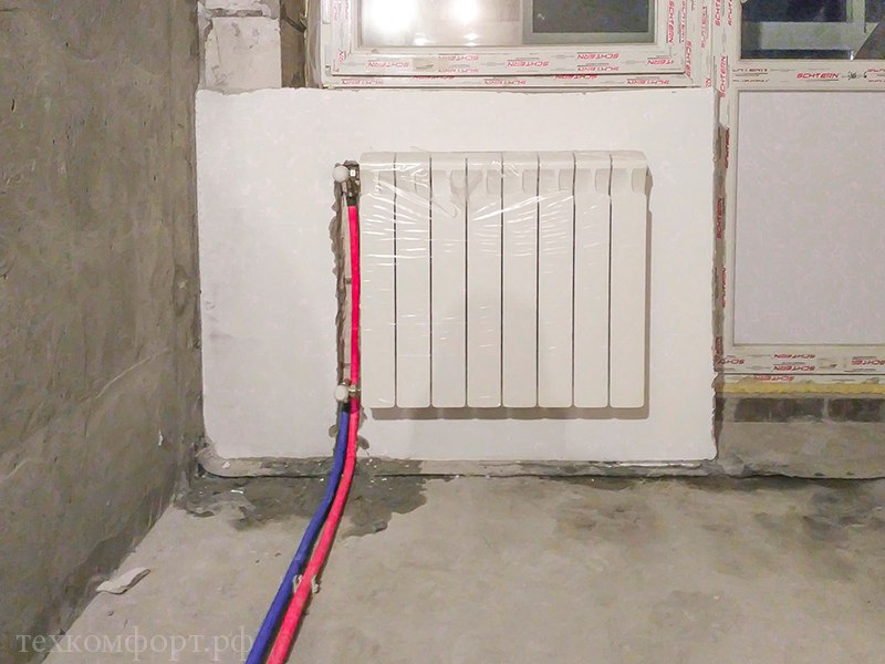 Aujourd'hui, les systèmes de chauffage sont posés à l'aide de tuyaux en plastique de petit diamètre, utilisant des pompes de circulation pour déplacer le liquide de refroidissement. Par conséquent, il est nécessaire d'assurer une fixation de haute qualité du radiateur afin qu'il ne casse pas les tuyaux. Il est préférable de l'accrocher à quelques broches métalliques enfoncées dans le mur ou de le monter sur des supports de sol en métal.