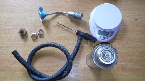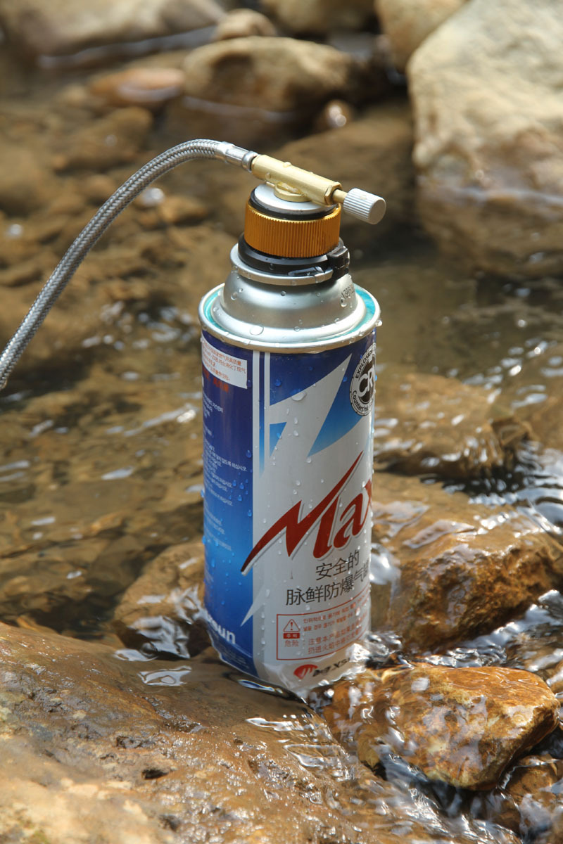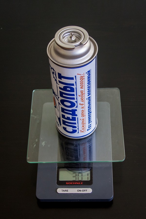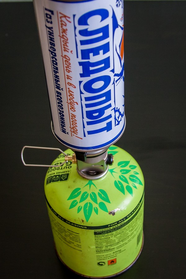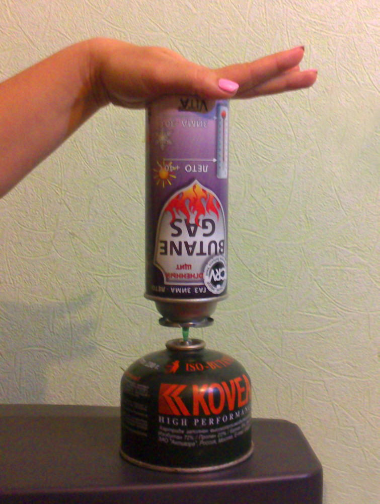 L'adaptateur est vissé sur la cartouche, qui est retournée, la cartouche est légèrement chauffée avec des mains chaudes, ce qui augmente le volume de gaz et accélère le processus de purge. Vidangez le condensat de préférence dans une bouteille en plastique. Il sent plutôt désagréable et sature les objets environnants avec l'odeur.