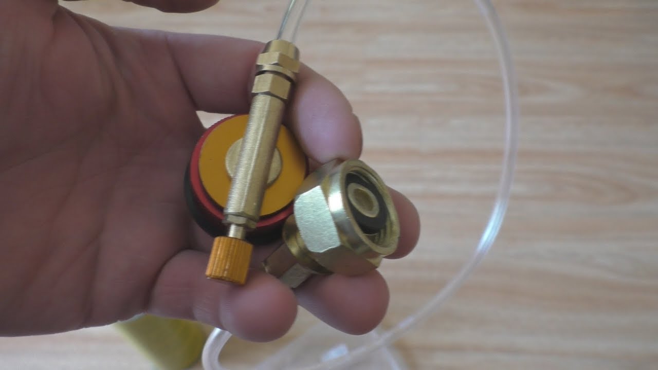 Étape 2. La préparation du système consiste à placer la bouteille de gaz dans une position stable avec la valve pointant vers le bas et en lui ouvrant un accès libre. En aucun cas le cylindre ne doit reposer sur la soupape. L'option idéale est de suspendre le ballon à l'envers. Ensuite, serrez l'adaptateur et ouvrez la valve du grand cylindre.