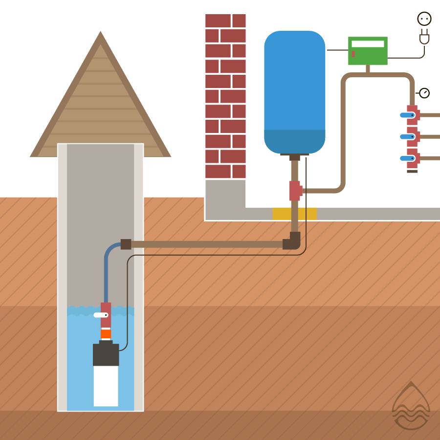 Pompe. Il existe des pompes de surface et celles qui sont complètement immergées dans l'eau sur un câble en acier. Un câble est connecté à la pompe et un tuyau d'eau part de la pompe.