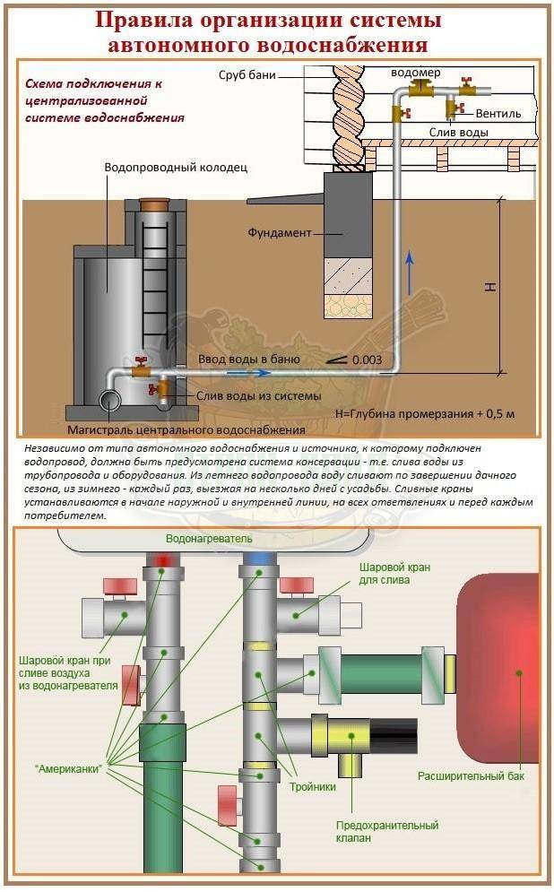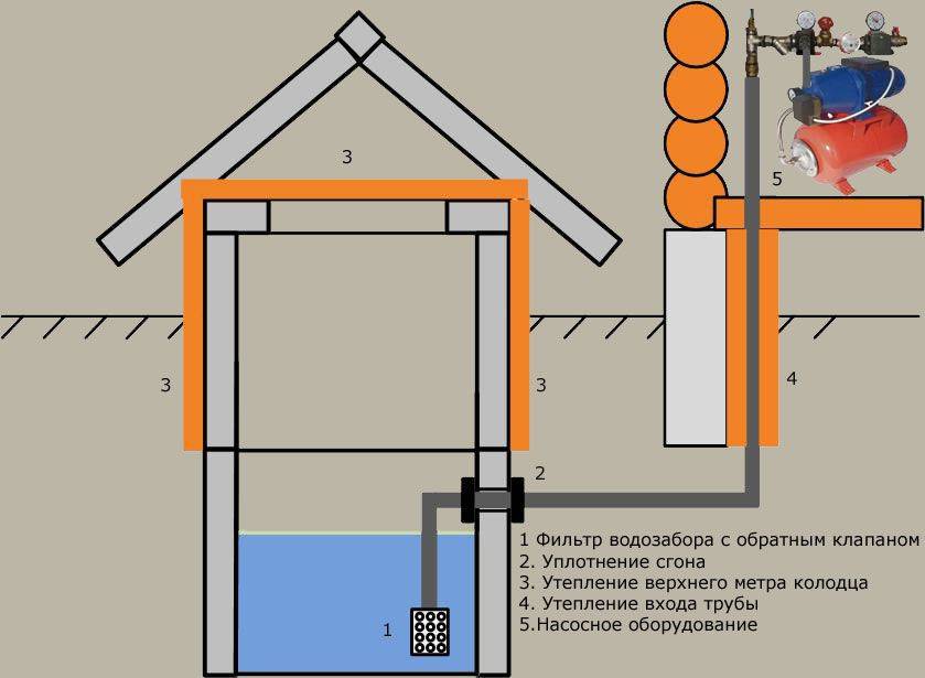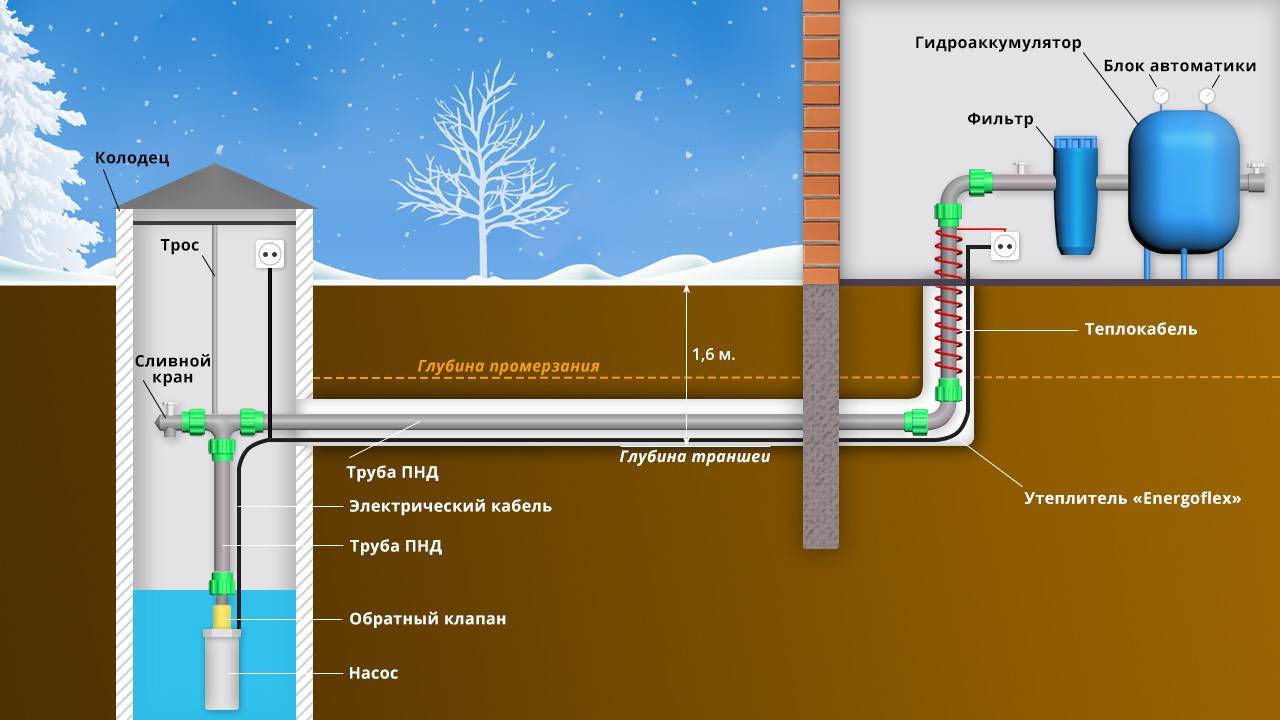 Autre nuance: l'alimentation en eau du puits vers la maison doit être installée sous une pente dirigée vers la vanne de vidange. Ainsi, il est possible de vidanger complètement l'eau de la structure sans aucun problème. A l'intérieur de la maison, tout le câblage est également équipé d'une pente obligatoire vers le tuyau d'alimentation, qui devient un tuyau de vidange lors de la conservation du système.