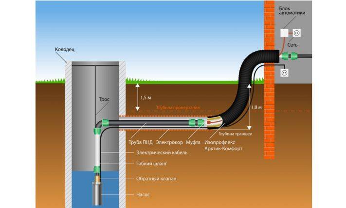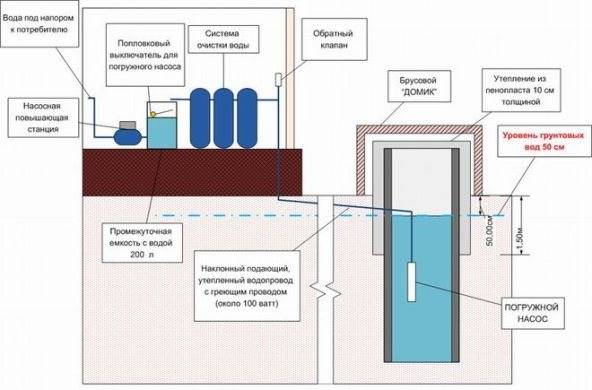 Si vous envisagez d'utiliser non pas une pompe profonde, mais une station de pompage, alors pour le fonctionnement du système en hiver, la connexion de la pompe au pipeline est agencée dans une fosse spéciale. Ses dimensions sont de 0,75x0,75 m et une profondeur de 100 cm.Le fond de la fosse doit être soigneusement tassé et recouvert de pierre concassée ou bétonnée, et les murs renforcés de briques ou de planches. Les tuyaux sont amenés dans la fosse et là, ils sont connectés à la pompe installée. Pour se protéger du froid, la fosse doit être parfaitement isolée.