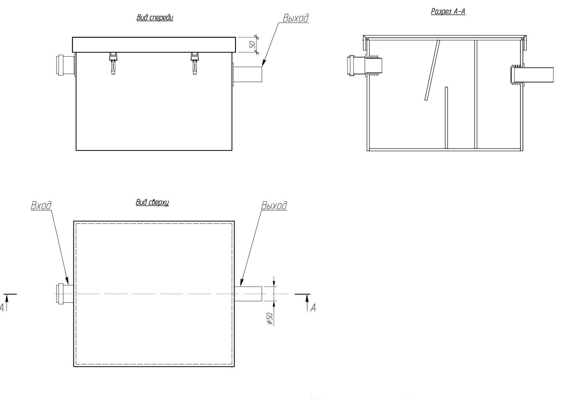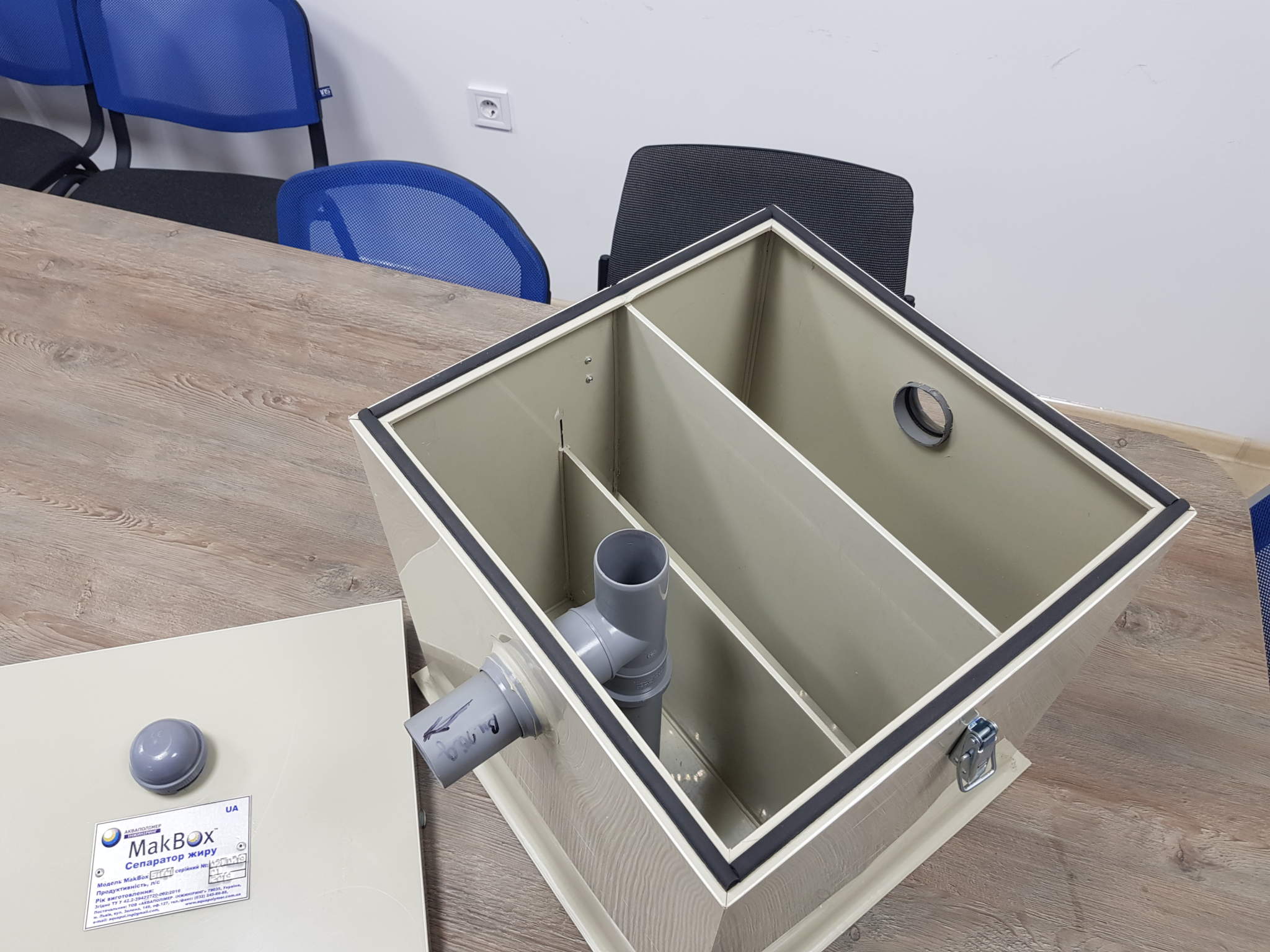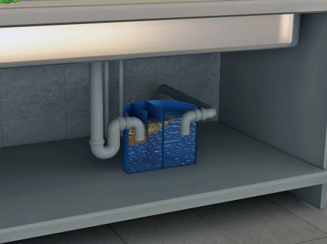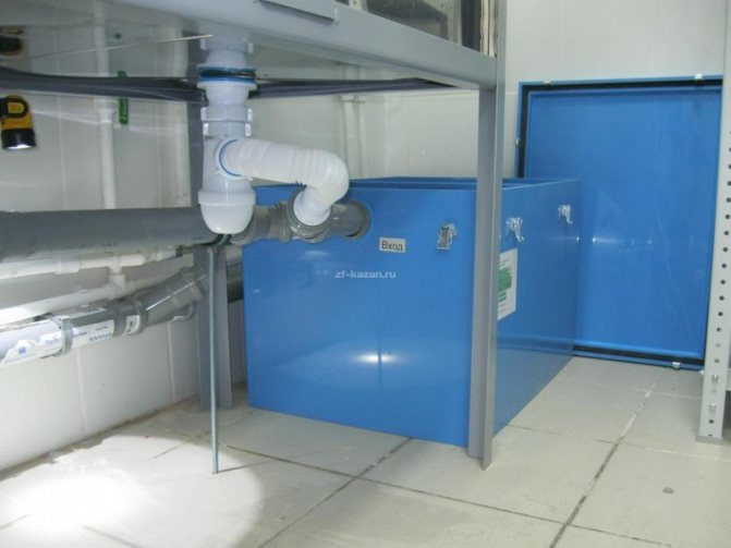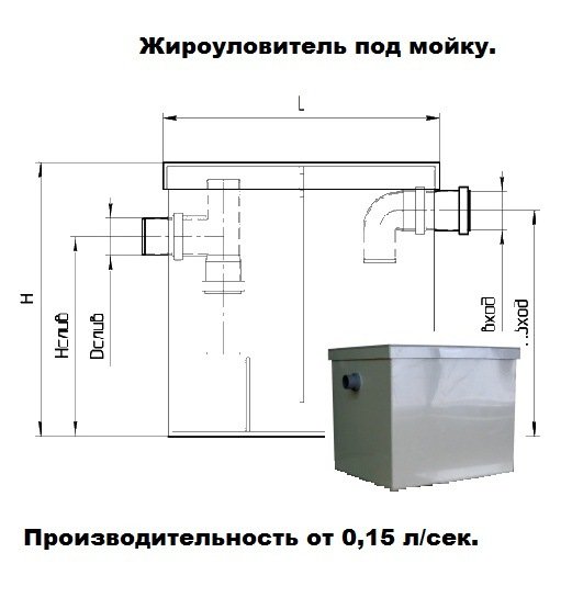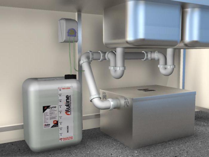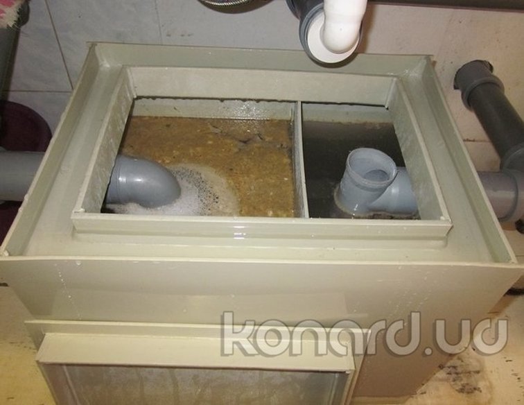 Comme vous pouvez le voir, l'utilisation d'un bac à graisse est tout à fait justifiée même à la maison. Considérons brièvement le dispositif d'une installation domestique. Le bac à graisse est un récipient complètement étanche avec un couvercle amovible, en plastique de qualité alimentaire et divisé en plusieurs sections. Les tuyaux de branchement sont connectés aux extrêmes, qui coupent dans la canalisation d'égout. Installé sous l'évier.