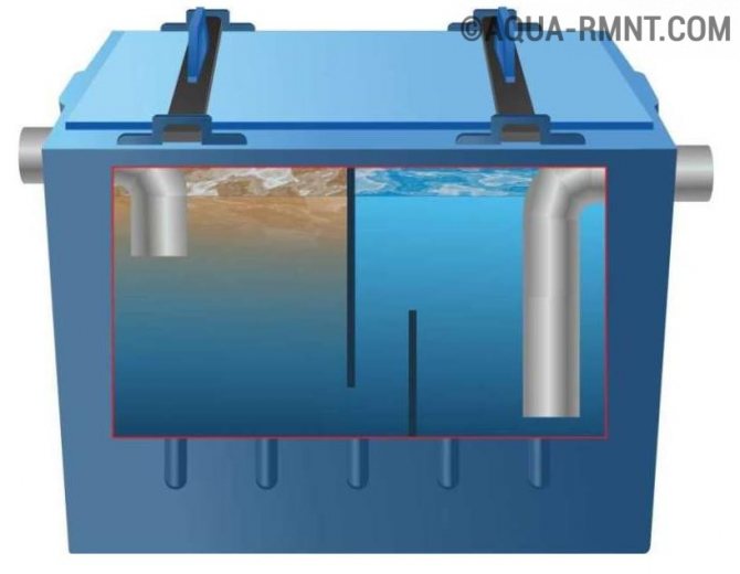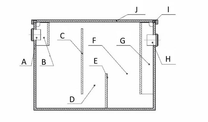 Les bacs à graisse fonctionnent sur le principe de la décantation gravitationnelle. Un séparateur de graisse domestique est un récipient en plastique divisé à l'intérieur par des cloisons en chambres. Dans le premier et le dernier compartiment, il y a des tuyaux de branchement pour les tuyaux de raccordement.