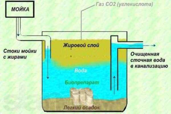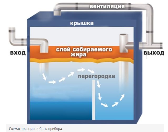 Le bac à graisse est classé comme une fosse septique. Toute l'eau utilisée y passe. Le principe de base du fonctionnement de l'installation est la différence entre les densités d'eau et de graisse. Tout d'abord, les effluents entrent dans le réservoir par le tuyau d'admission. La graisse étant moins dense, ses particules flottent à la surface de l'eau et, grâce aux cloisons installées à travers elles, sont évacuées de là vers un réservoir de stockage spécial. La graisse accumulée dans le bac à graisse ménager ne peut être éliminée que manuellement.